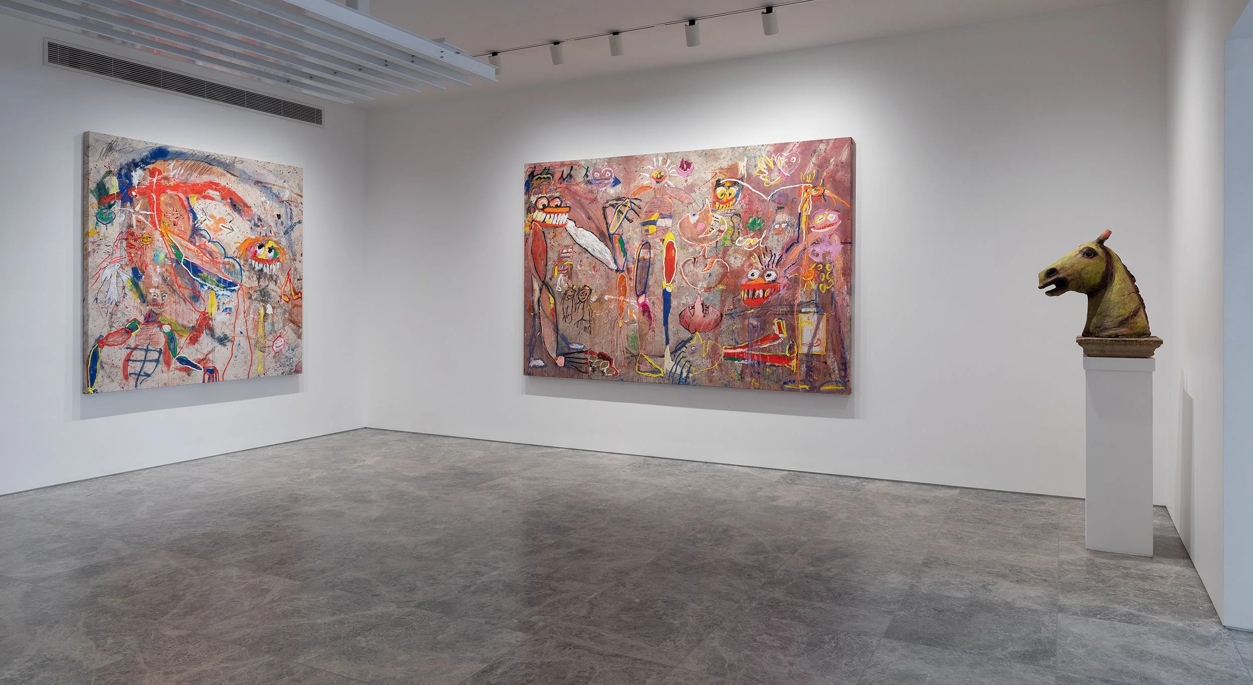 Saxon Quinn’s latest body of work, Little Darlin’, is bold, colourful and chaotic, incorporating a whole range of textures to make huge, bright, layered pieces on canvas. The works bring together manic faces, stylised bodies, figures and markings. He draws recognisable influences from pop culture (from Nina Simone to Biker Mice and Street Sharks) alongside slightly more cryptic nods to his personal history, including childhood sketchpads that his mother held onto for the past 35 years. In the works that make up Little Darlin’, he sketches a horse’s head and repeats stylised versions of sculpted figures and colourful faces throughout the series, a direct response to his mother, Australian artist Dianne Coulter, and her influence on him. Saxon’s mum is a talented, imaginative, and well-celebrated sculptor and painter who has been exhibiting since 1975.